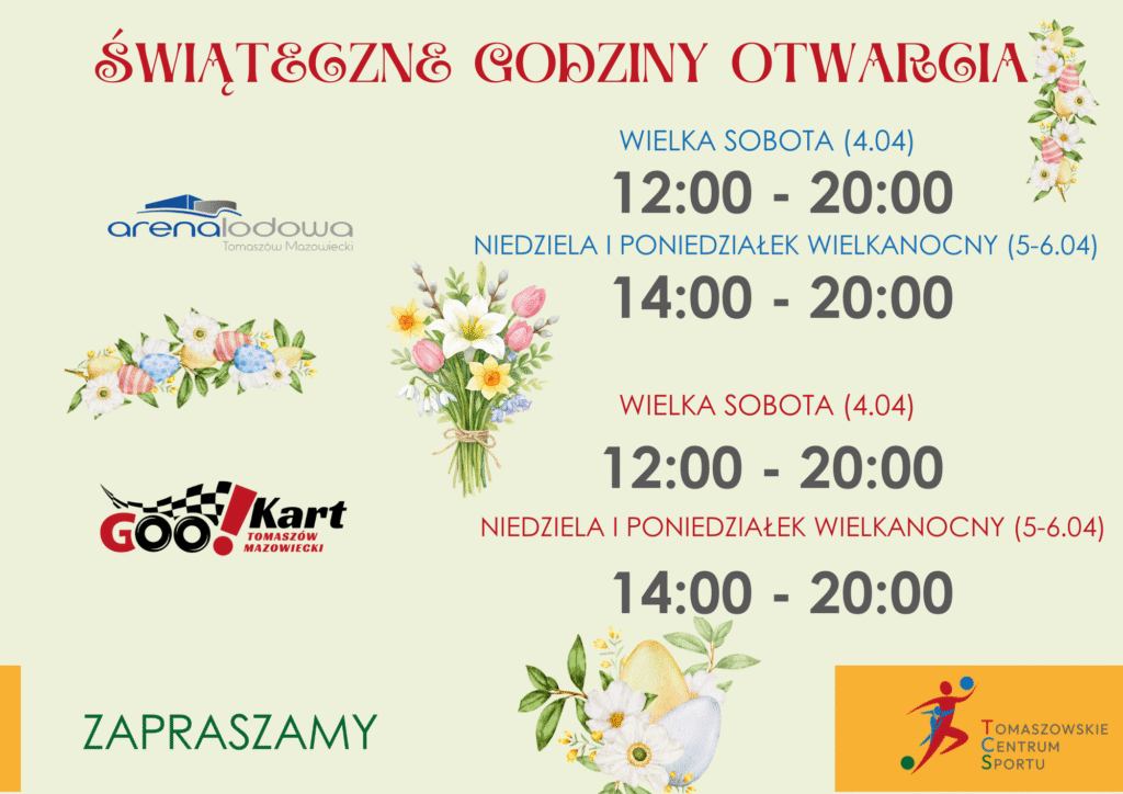 W Wielką Sobotę (4 kwietnia) obiekty będą czynne w godzinach od 12:00 do 20:00. Natomiast w Niedzielę i Poniedziałek Wielkanocny (5–6 kwietnia) zapraszamy od 14:00 do 20:00.
