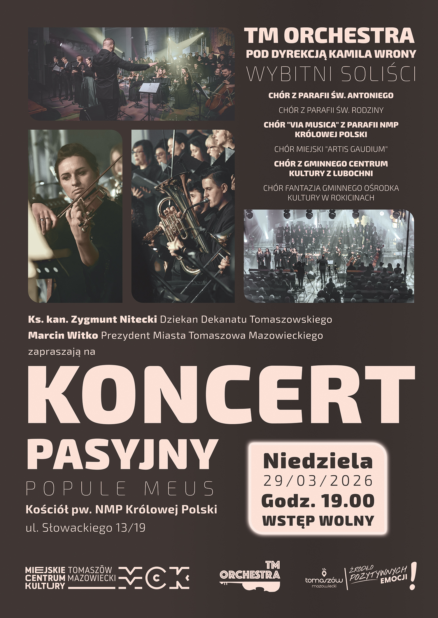 TM Orchestra pod dyrekcją Kamila Wrony, wybitni soliści oraz chóry: Chór z Parafii św. Antoniego, Chór z Parafii św. Rodziny, Chór „Via Musica” z parafii NMP Królowej Polski, Chór Miejski „Artis Gaudium”, Chór z Gminnego Centrum Kultury w Lubochni, Chór Fantazja z Gminnego Ośrodka Kultury w Rokicinach wystąpią podczas Koncertu Pasyjnego Popule Meus. Kościół pw. NMP Królowej Polski, ul. Słowackiego 13/19, Niedziela 29.03.2026 r. godzina 19. Wstęp wolny.