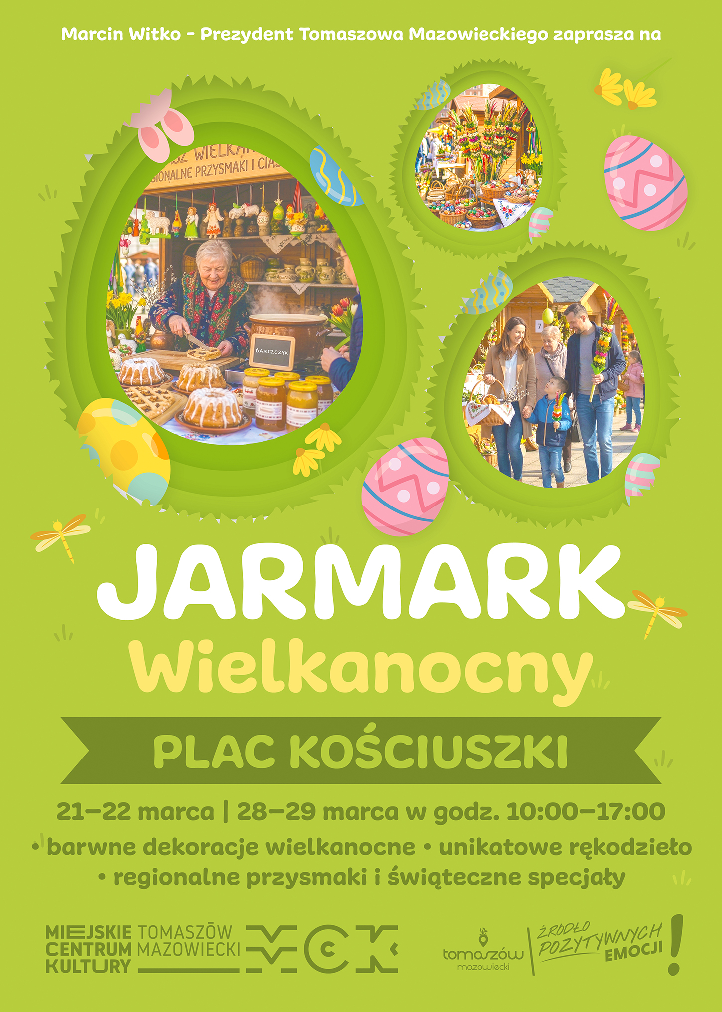 Tomaszowski Jarmark Wielkanocny odbędzie się na Placu Kościuszki w godzinach 10:00–17:00 w dniach 28–29 marca. Na odwiedzających czekać będą barwne dekoracje wielkanocne oraz unikatowe rękodzieło, a o podniebienia zadbają regionalne przysmaki i świąteczne specjały, którym towarzyszyć będzie wyjątkowa, rodzinna atmosfera w samym sercu miasta.