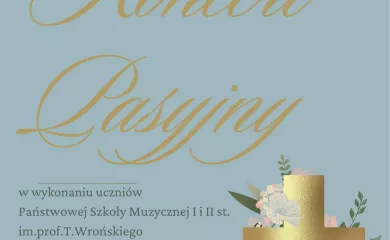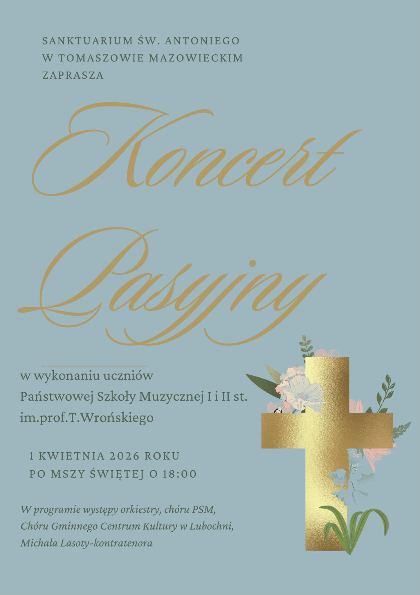 Na koncert pasyjny zaprasza również Państwowa Szkoła Muzyczna I i II stopnia, koncert odbędzie się w środę, 1 kwietnia po mszy świętej o godzinie 18, w SANKTUARIUM ŚW. ANTONIEGO. Wystąpi chór Państwowej Szkoły Muzycznej, orkiestra, chór Gminnego Centrum Kultury w Lubochni oraz kontratenor Michał Lasota.