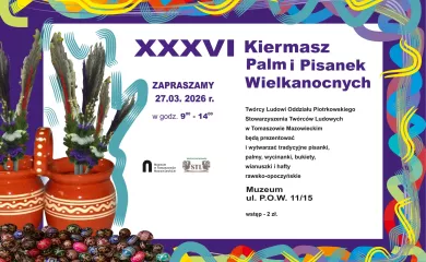 Muzeum w Tomaszowie Mazowieckim i twórcy skupieni w Stowarzyszeniu Twórców Ludowych zapraszają na XXXVI Kiermasz Palm i Pisanek Wielkanocnych, który odbędzie się w piątek 27 marca 2026 r. w godzinach 9-14. Wstęp 2 zł. W czasie Kiermaszu Twórcy Ludowi Oddziału Piotrkowskiego Stowarzyszenia Twórców Ludowych w Tomaszowie Mazowieckim będą prezentować i wytwarzać tradycyjne pisanki, palmy, wycinanki, bukiety, wianuszki i hafty rawsko-opoczyńskie.