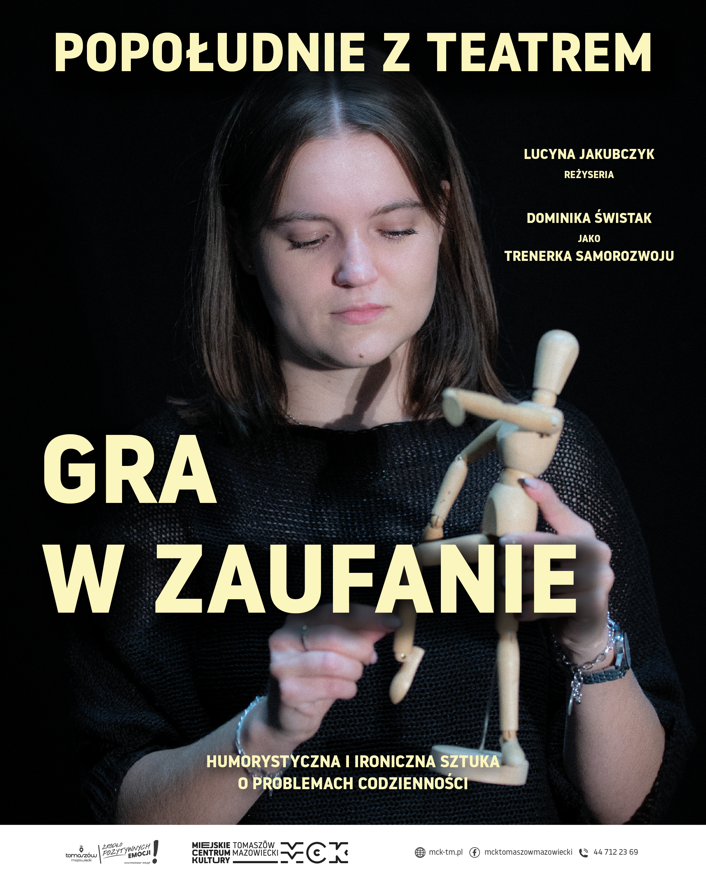 MCK zaprasza na wyjątkowe spotkanie z teatrem w ramach cyklu „Popołudnie z teatrem”. Wydarzenie odbędzie się w piątek, 21 listopada 2025 roku, o godzinie 18:00 w Miejskim Centrum Kultury Tkacz. Na scenie zobaczymy Dominikę Świstak, wcielającą się w rolę trenerki samorozwoju, w pełnym dystansu i humoru monodramie „Gra w zaufanie”, w reżyserii Lucyny Jakubczyk. Wstęp wolny.