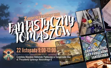 Już w sobotę, 22 listopada kolejna edycja wydarzenia „Fantastyczny Tomaszów”. Od 9 do 13 zapraszamy do czytelni Miejskiej Biblioteki Publicznej w Tomaszowie Mazowieckim przy ul. Prez. I. Mościckiego 6 (dawne kino Włókniarz) na kolejną porcję grania i dyskusji o grach i fantastyce. W programie gry planszowe, sesja RPG, rozmowy o RPG, planszówkach i fantastyce.