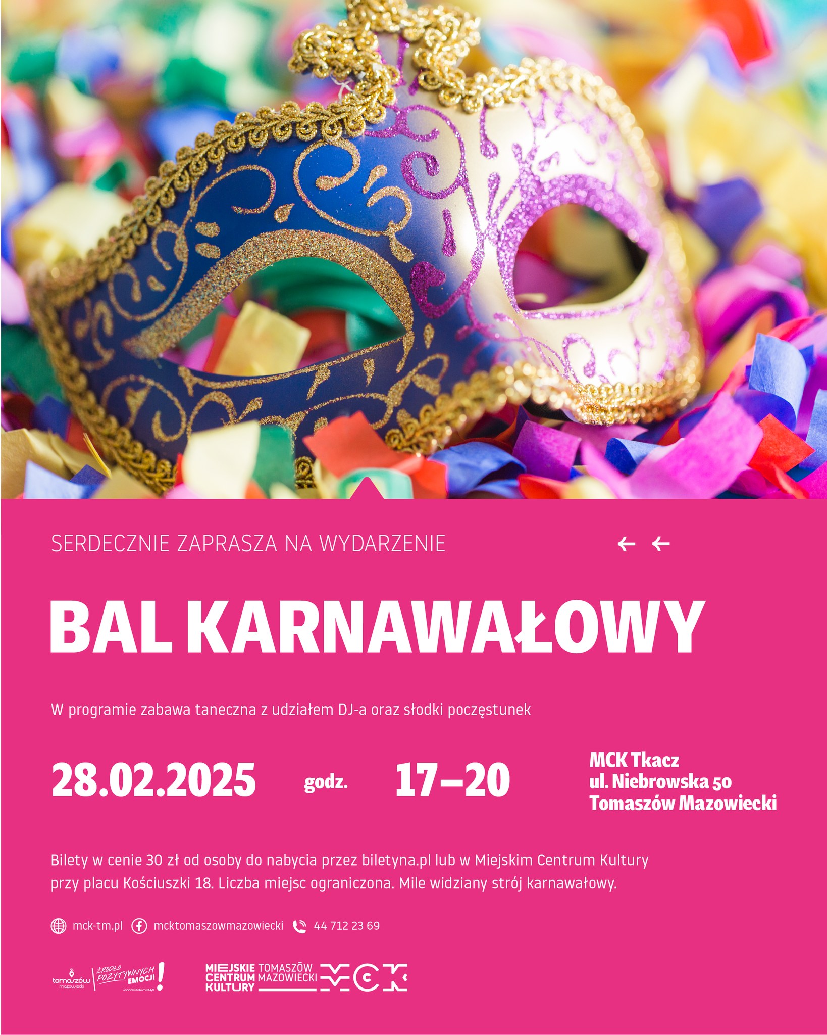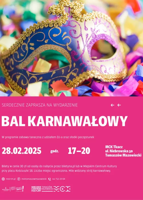 Miejskie Centrum Kultury zaprasza na Bal Karnawałowy. Przygotuj się na wieczór pełen muzyki, tańca i karnawałowej magii! Już 28 lutego w godz. 17:00–20:00 MCK Tkacz zaprasza na niezapomnianą zabawę z DJ-em!