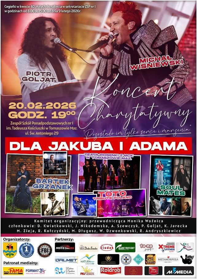 Charytatywny Koncert na rzecz Jakuba i Adama odbędzie się 20 lutego 2026 roku w Zespole Szkół Ponadpodstawowych nr 1 im. Tadeusza Kościuszki w Tomaszowie Mazowieckim.