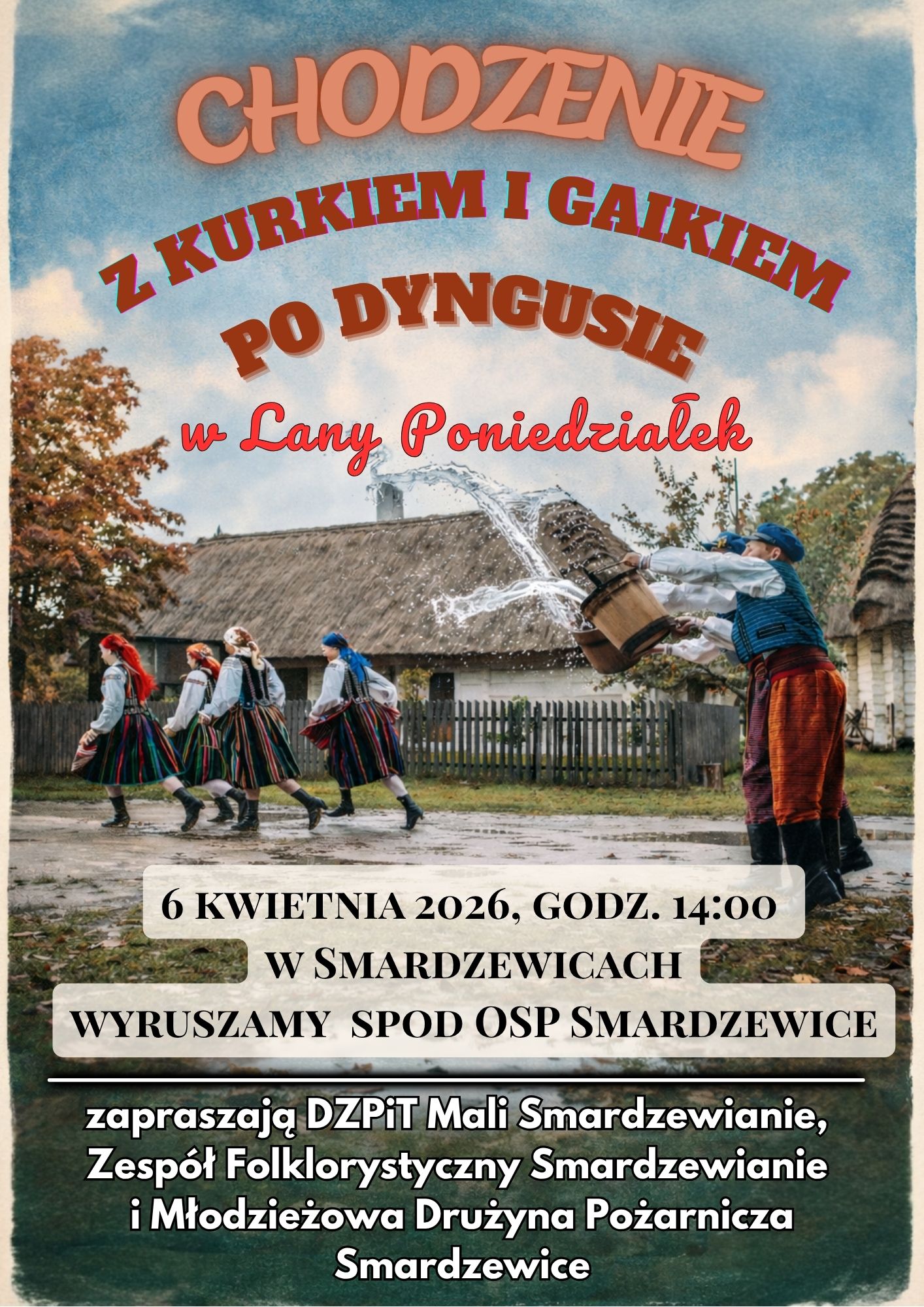 Zapraszamy na wyjątkowe wydarzenie kultywujące tradycje ludowe – chodzenie z kurkiem i gaikiem po dyngusie, które odbędzie się w Lany Poniedziałek, 6 kwietnia 2026 roku o godzinie 14:00 w Smardzewicach.