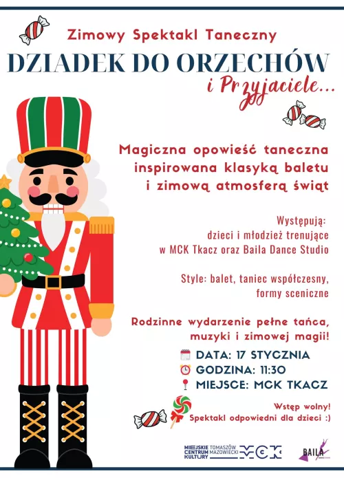 Miejskie Centrum Kultury razem z Baila Dance Studio TM zapraszają na magiczny zimowy spektakl, podczas którego scena zamieni się w baśniową krainę tańca. Młodzi tancerze w wieku od 6 do 14 lat zaprezentują świąteczno-noworoczne choreografie inspirowane klasyką baletu, zimowymi opowieściami oraz dziecięcą wyobraźnią.