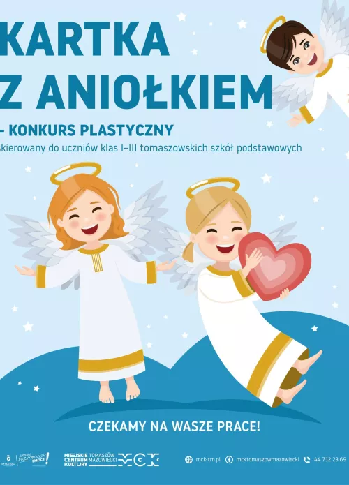 Miejskie Centrum Kultury zaprasza uczniów klas I–III szkoły podstawowej do udziału w świątecznym konkursie plastycznym. Zadaniem uczestników jest wykonanie kartki świątecznej z motywem aniołka. Termin nadsyłania prac upływa 17 grudnia 2025 r., a gotowe kartki należy dostarczyć do Miejskiego Centrum Kultury przy placu Kościuszki 18.