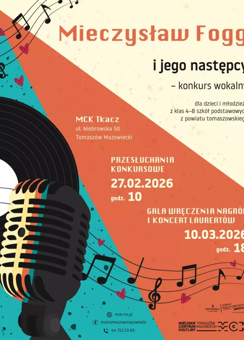 Czy da się połączyć klimat dawnych piosenek z energią młodego pokolenia? MCK mówi: TAK! Tomaszów Mazowiecki zabrzmi klasyką w nowym wydaniu — wszystko za sprawą Konkursu Wokalnego „Mieczysław Fogg i jego następcy”, organizowanego w Roku Mieczysława Fogga.