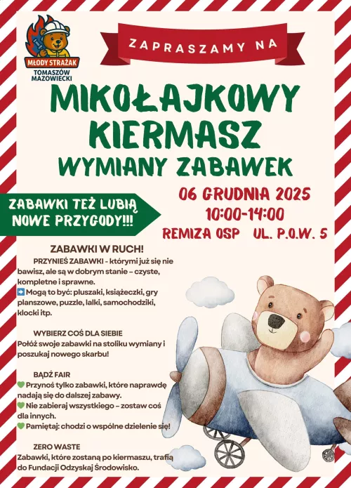 Dziecięca i Młodzieżowa Drużyna Pożarnicza działająca przy Ochotniczej Straży Pożarnej w Tomaszowie Mazowieckim serdecznie zaprasza na Mikołajkowy Kiermasz Wymiany Zabawek.