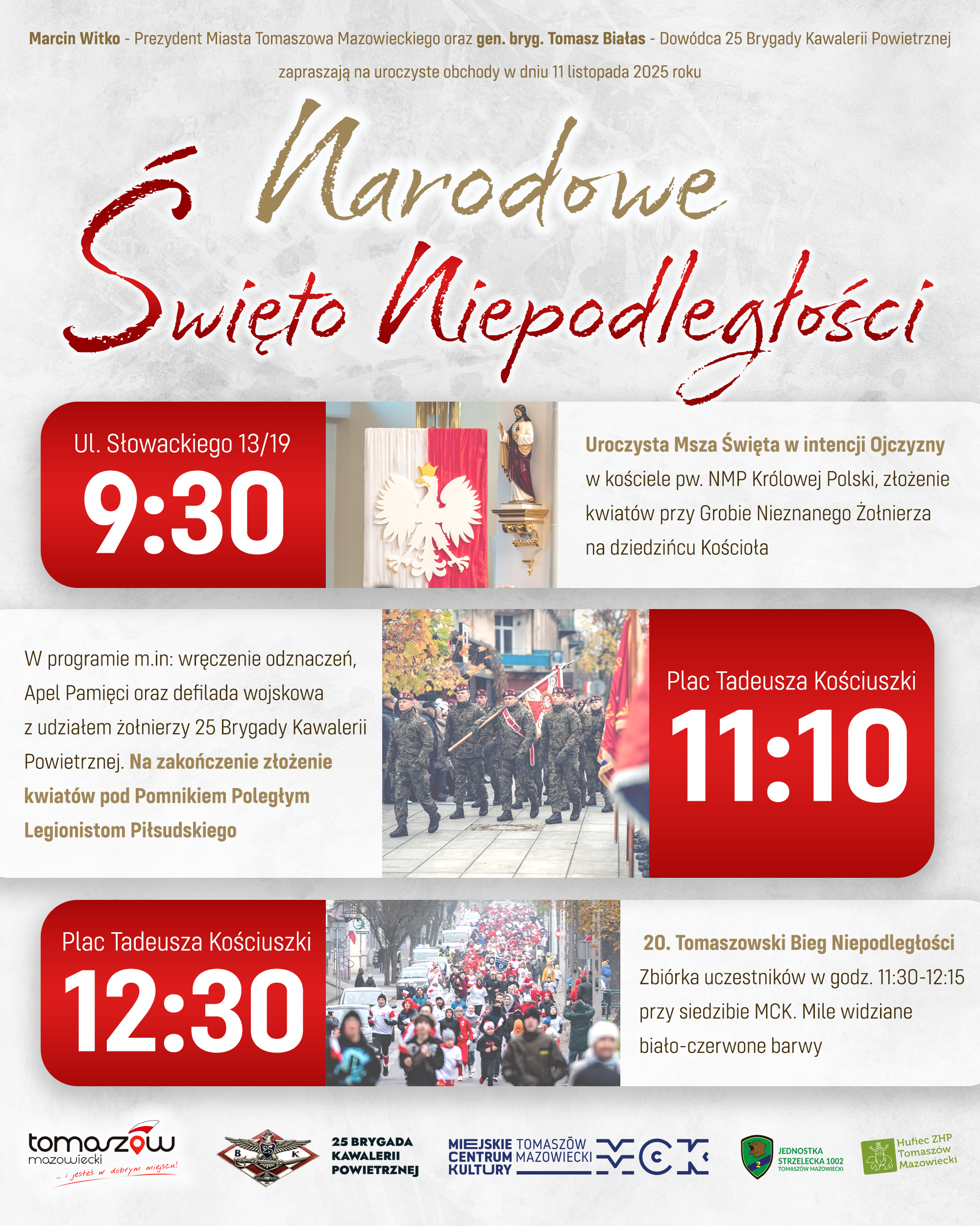 Marcin Witko – Prezydent Tomaszowa Mazowieckiego, Barbara Klatka – Przewodnicząca Rady Miejskiej Tomaszowa Mazowieckiego oraz gen. bryg. Tomasz Białas – Dowódca 25 Brygady Kawalerii Powietrznej zapraszają na uroczyste obchody Narodowego Święta Niepodległości.