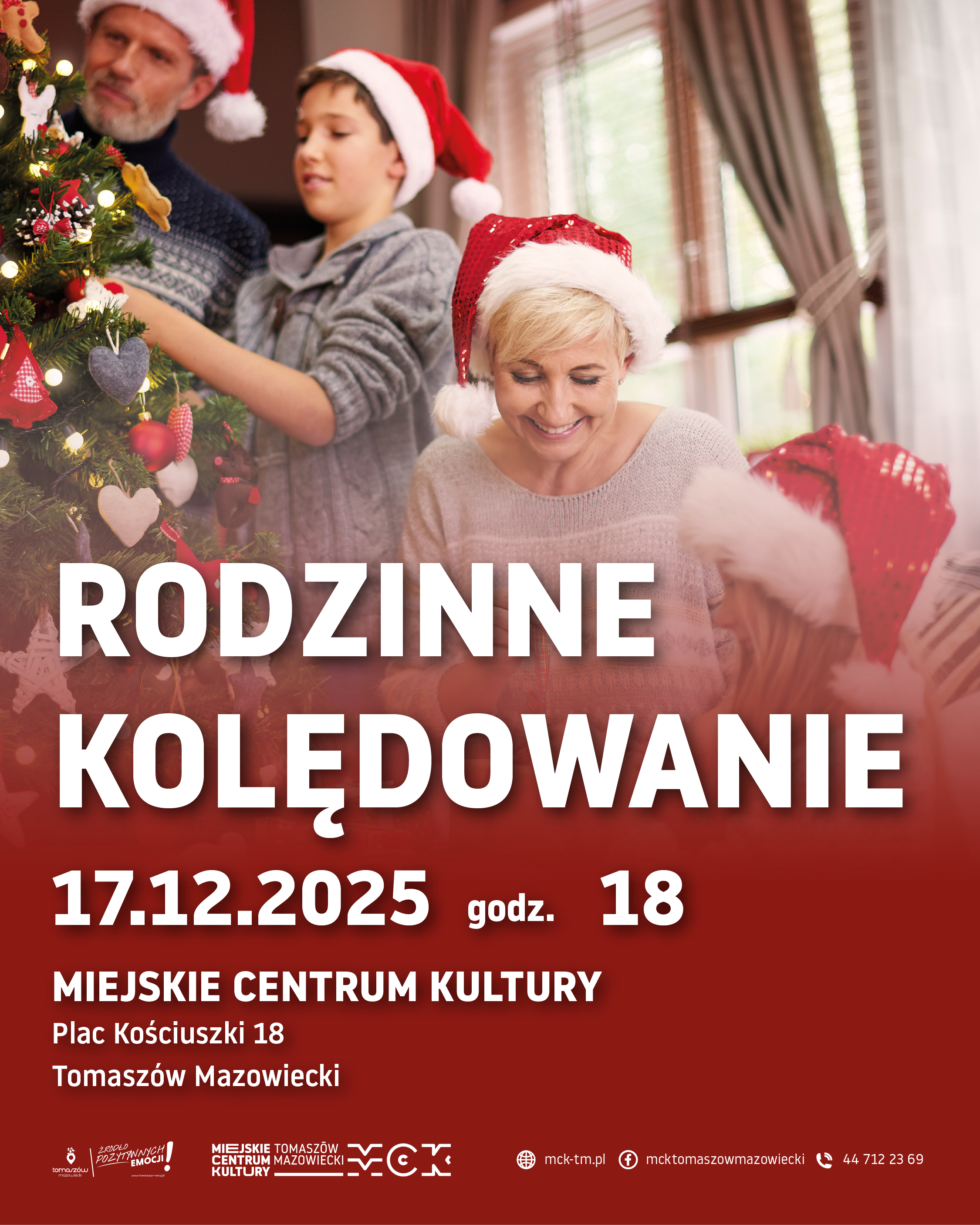 Miejskie Centrum Kultury zaprasza na Koncert „Rodzinne kolędowanie”, który odbędzie się 17 grudnia 2025 r. o godzinie 18:00 w siedzibie MCK w Tomaszowie Mazowieckim, Plac Kościuszki 18. Podczas wydarzenia swoje talenty zaprezentują nasze sekcje artystyczne, w tym: sekcja wokalna, sekcja gitarowa, wykonawcy utworów fortepianowych, uczestnicy zajęć teatralnych. Koncert będzie okazją do wspólnego kolędowania i poczucia magii nadchodzących Świąt Bożego Narodzenia. Wydarzenie ma charakter otwarty i jest skierowane do całych rodzin.