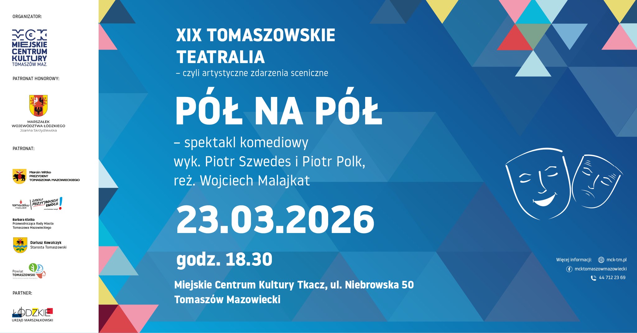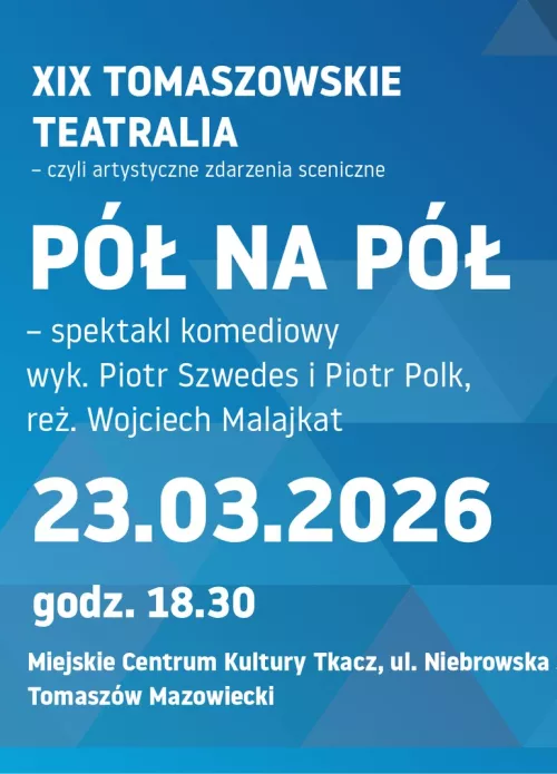 Bilety na spektakl dostępne w Sekretariacie Miejskiego Centrum Kultury przy Placu Kościuszki 18 i online w serwisie biletyna.pl: https://biletyna.pl/spektakl/Pol-na-pol