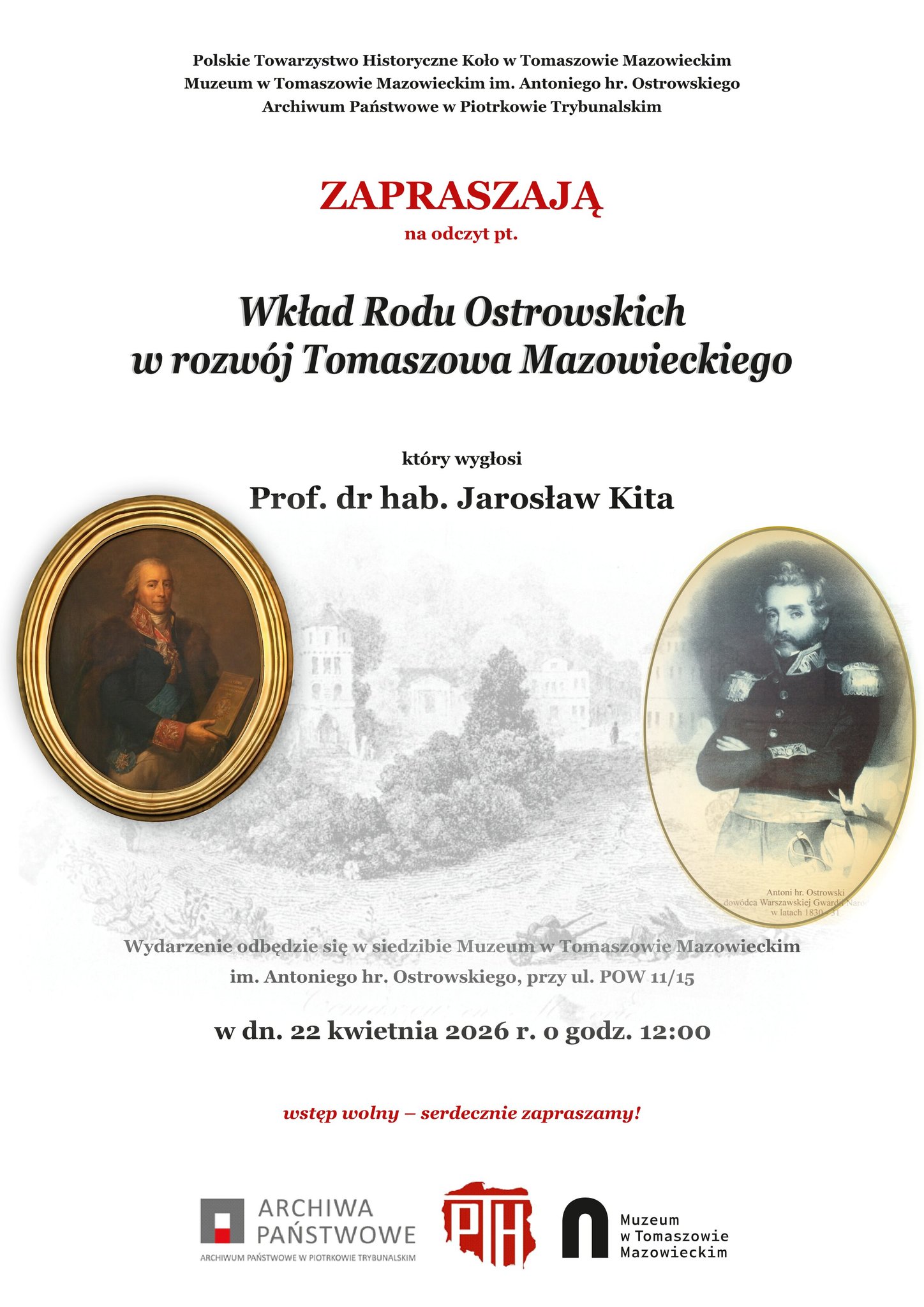 Muzeum w Tomaszowie Mazowieckim zaprasza na wykład prof. Jarosława Kity pt. „Wkład Rodu Ostrowskich w rozwój Tomaszowa Mazowieckiego”, który odbędzie się w środę 22 kwietnia 2026 r. o godz. 12.00. Wstęp wolny!