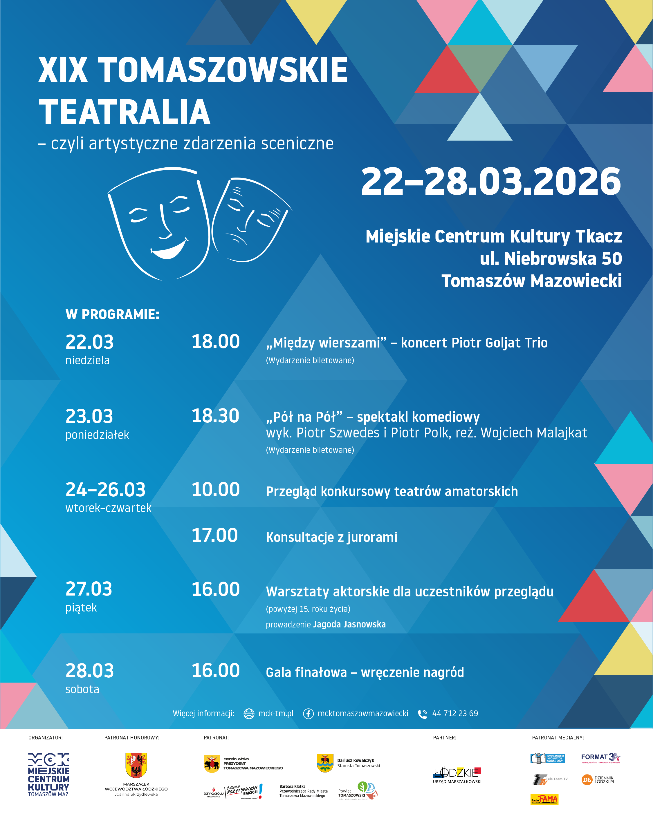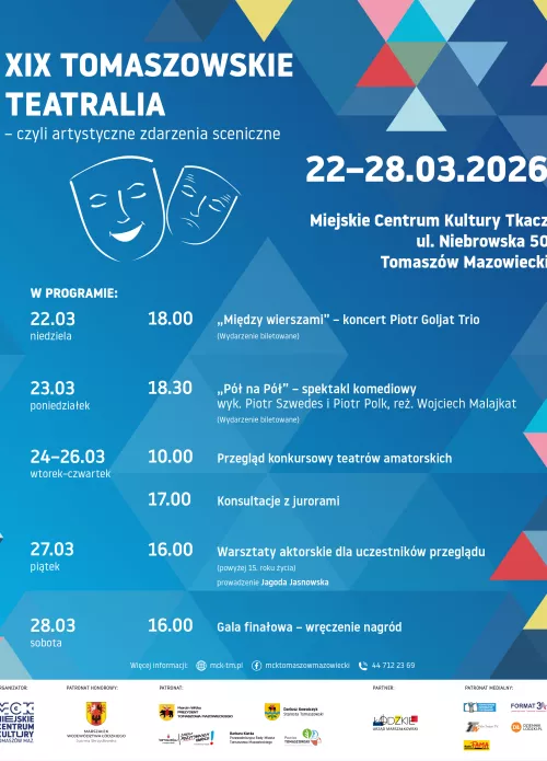 XIX edycja Tomaszowskich Teatraliów odbędzie się w dniach 22-28 marca 2026 roku w Miejskim Centrum Kultury Tkacz w Tomaszowie Mazowieckim.