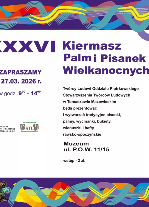 Muzeum w Tomaszowie Mazowieckim i twórcy skupieni w Stowarzyszeniu Twórców Ludowych zapraszają na XXXVI Kiermasz Palm i Pisanek Wielkanocnych, który odbędzie się w piątek 27 marca 2026 r. w godzinach 9-14. Wstęp 2 zł. W czasie Kiermaszu Twórcy Ludowi Oddziału Piotrkowskiego Stowarzyszenia Twórców Ludowych w Tomaszowie Mazowieckim będą prezentować i wytwarzać tradycyjne pisanki, palmy, wycinanki, bukiety, wianuszki i hafty rawsko-opoczyńskie.