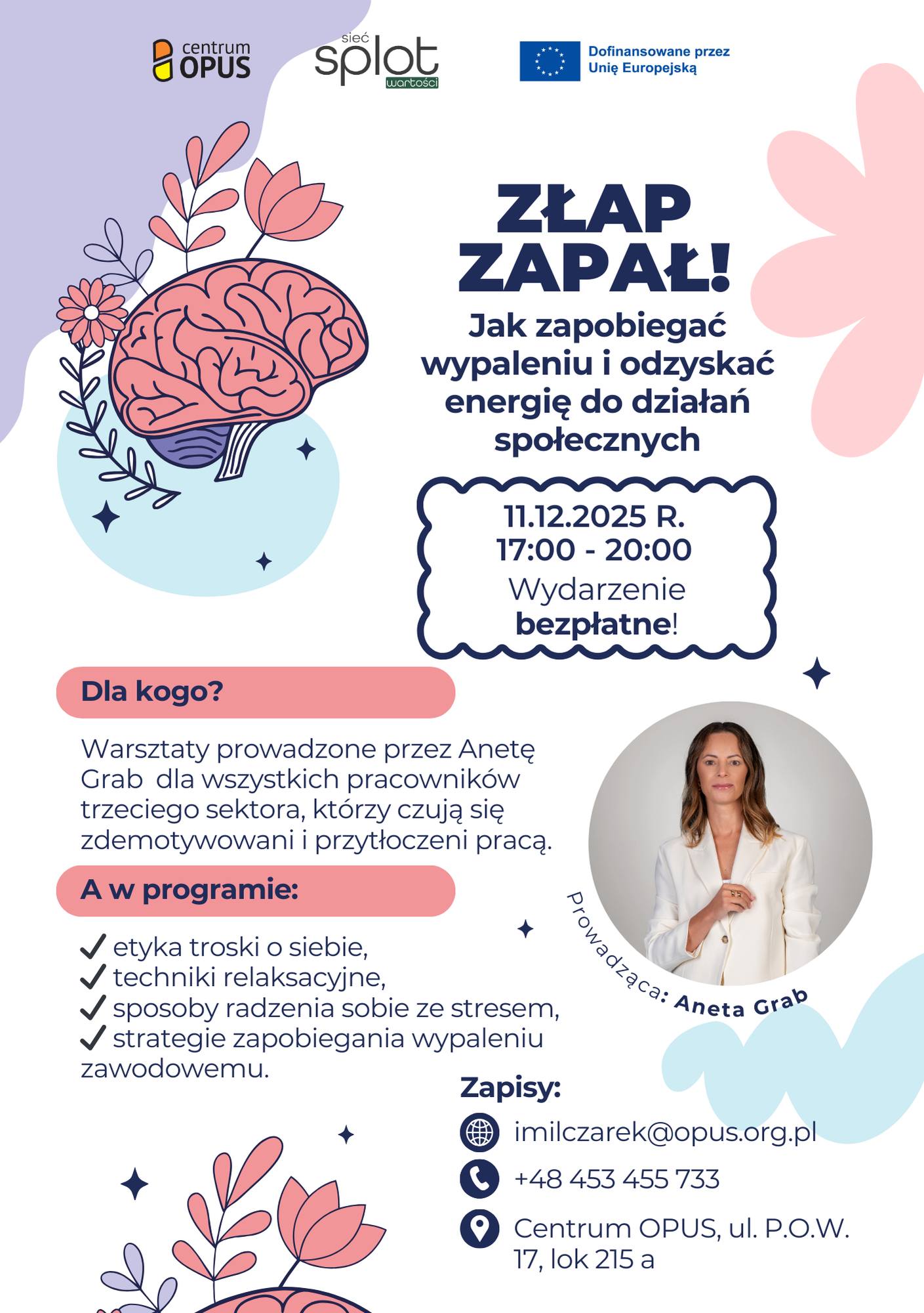 Prowadząca: Aneta Grab - ekspertka z 25-letnim doświadczeniem w pracy z ludźmi, autorka metody Inside Your Life® i konsultantka kryzysowa, która od lat tworzy szkolenia oparte na psychologii, coachingu i realnej praktyce. Aktywnie działa społecznie, prowadząc kampanie przeciw przemocy i wspierając osoby w kryzysie. Na warsztatach wnosi wiedzę, doświadczenie i energię osoby, która konsekwentnie buduje swoją ścieżkę i pomaga innym odzyskiwać równowagę. Spotkanie to świetna okazja do zdobycia wiedzy, wymiany doświadczeń i nawiązania lokalnych kontaktów.